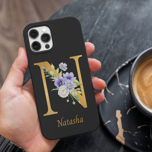 Floral Gold-Letter Big Initial Custom Name - Protective Phone Case for iPhone, Samsung Galaxy and Google Pixel